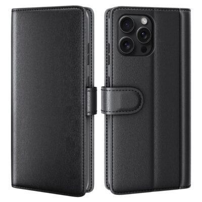 Klassiseen tyyliin muotoiltu, vahva ja käytännöllinen musta nahkakotelo on erinomainen suoja Apple iPhone 16 Pro -puhelimelle.