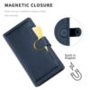 Hillityn kaunis sininen lompakko useilla maksuvälinepaikoilla, jossa Apple iPhone 13 mini on hyvässä suojassa osumilta ja säröiltä.