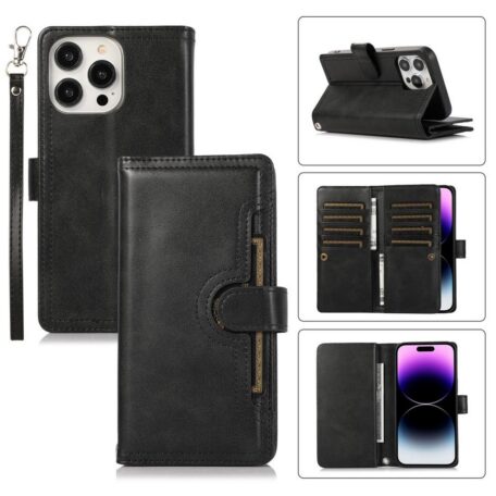 Ajattoman tyylikäs musta väri ja kaunis muotoilu tilavassa lompakossa, joka suojaa Apple iPhone 15 puhelinmallia vaurioilta.
