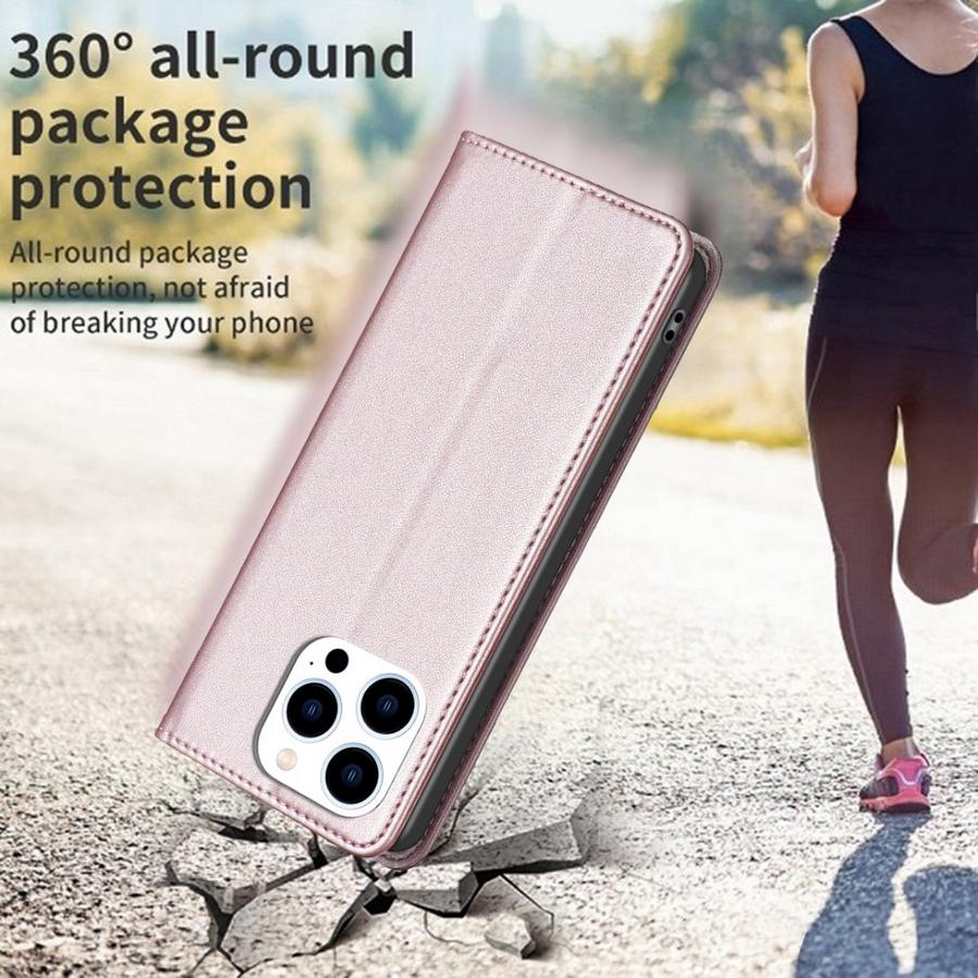 Suloiseen vaaleanpunaiseen väriin puettu lompakkomallinen kotelo tuo suojan vaurioitumiselta Apple iPhone 15 Pro -puhelimellesi.