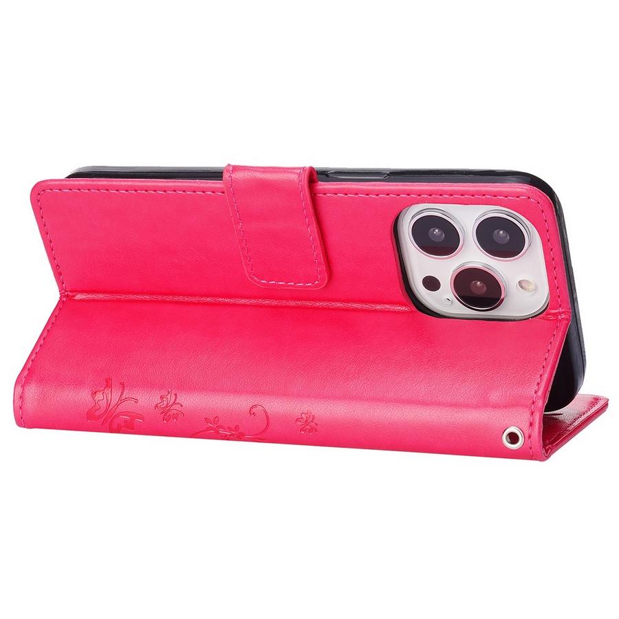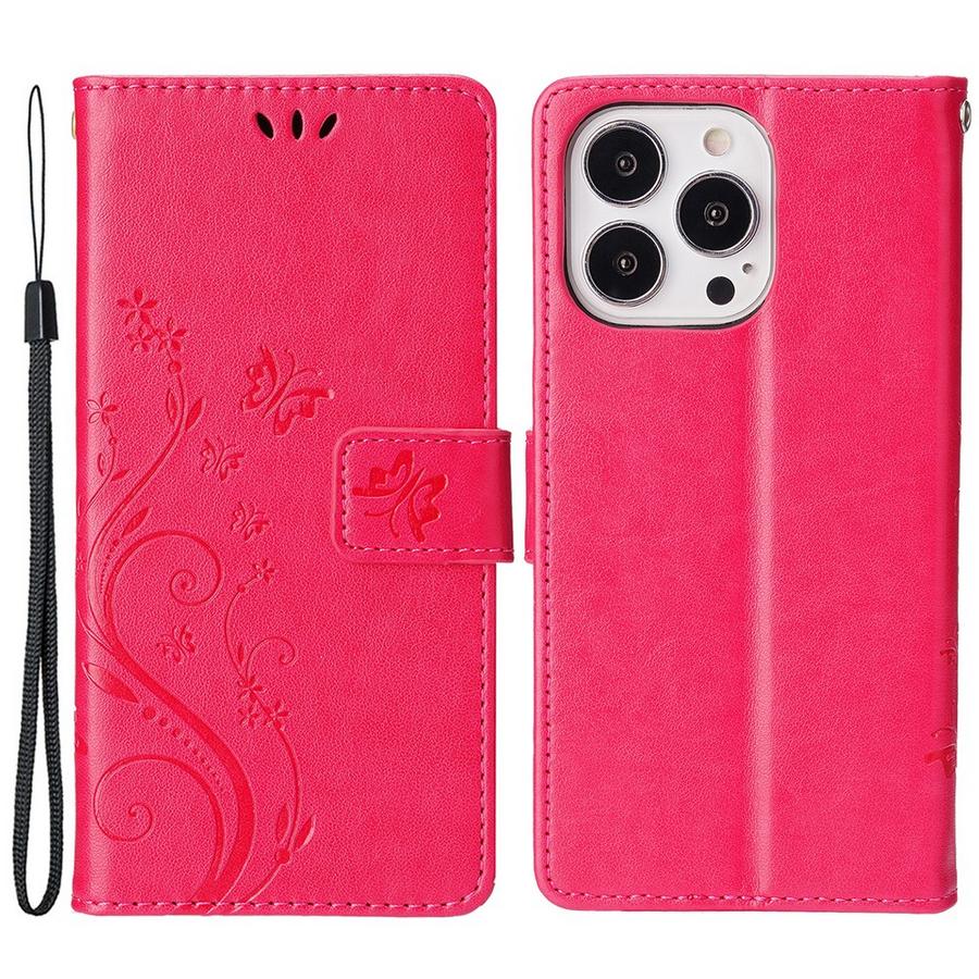 Apple iPhone 15 Pro puhelimen suojaamiseen pirteän sävyinen pinkki kotelo, jonka kannet on koristettu painokuvioiduilla perhosilla ja kukilla.