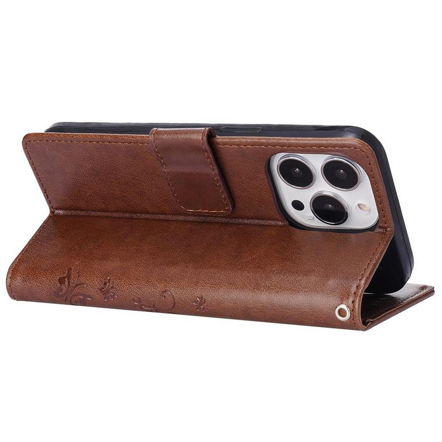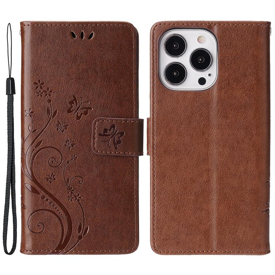 Luonnollisen sävyisen tummanruskean kotelon kansia kuvioivat painetut perhoset sekä kukat, Apple iPhone 15 Pro puhelinmallin suoja.