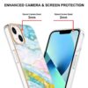 Vahingoilta ja kolhuilta lujasti suojaava takakuori Apple iPhone 15 puhelimelle, ihastuttavat turkoosit värisävyt marmorikuvioinnissa.