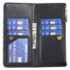 Maksu- ja henkilöllisyyskortteja varten on yhdeksän paikkaa, seteleille leveä tasku ja kolikoille tai vaikkapa kuulokkeille vetoketjutasku.