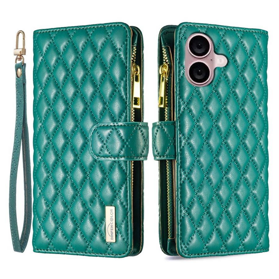 Kauniilla ruudutuksella kuvioidun, tilavan tummanvihreän lompakon ulkoasu on tyylikäs ja Apple iPhone 16 puhelin on kattavasti suojattu.
