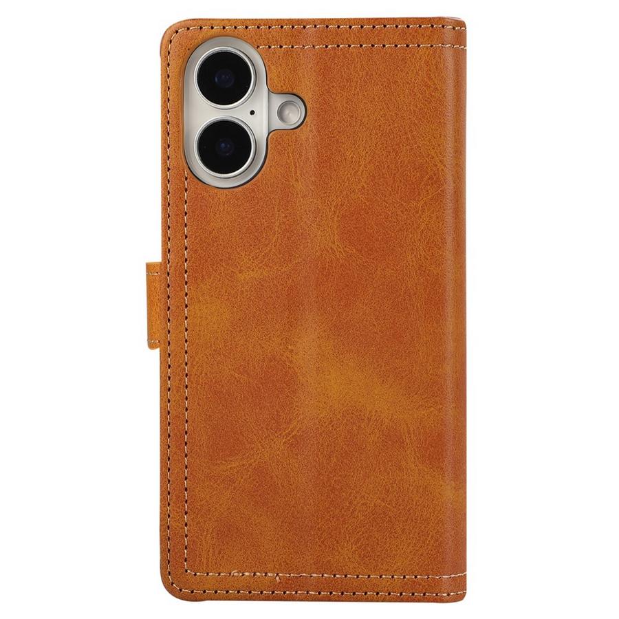 Tyylikäs ja viimeistellyn kaunis vaaleanruskea lompakko, jossa Apple iPhone 16 puhelin on erinomaisesti suojattu vahingoilta.
