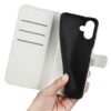 Hillitysti kuvioitu elegantin valkoinen lompakko on tilava sekä sisältää suojan Apple iPhone 16 Plus puhelimen turvalliseen kuljettamiseen.