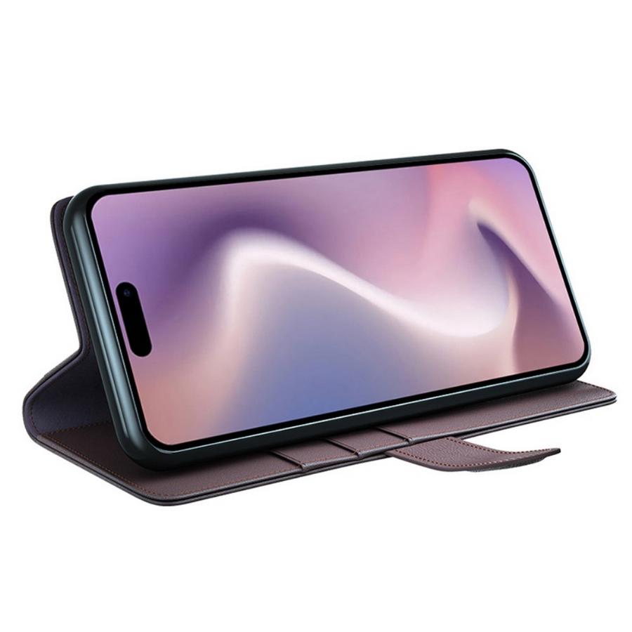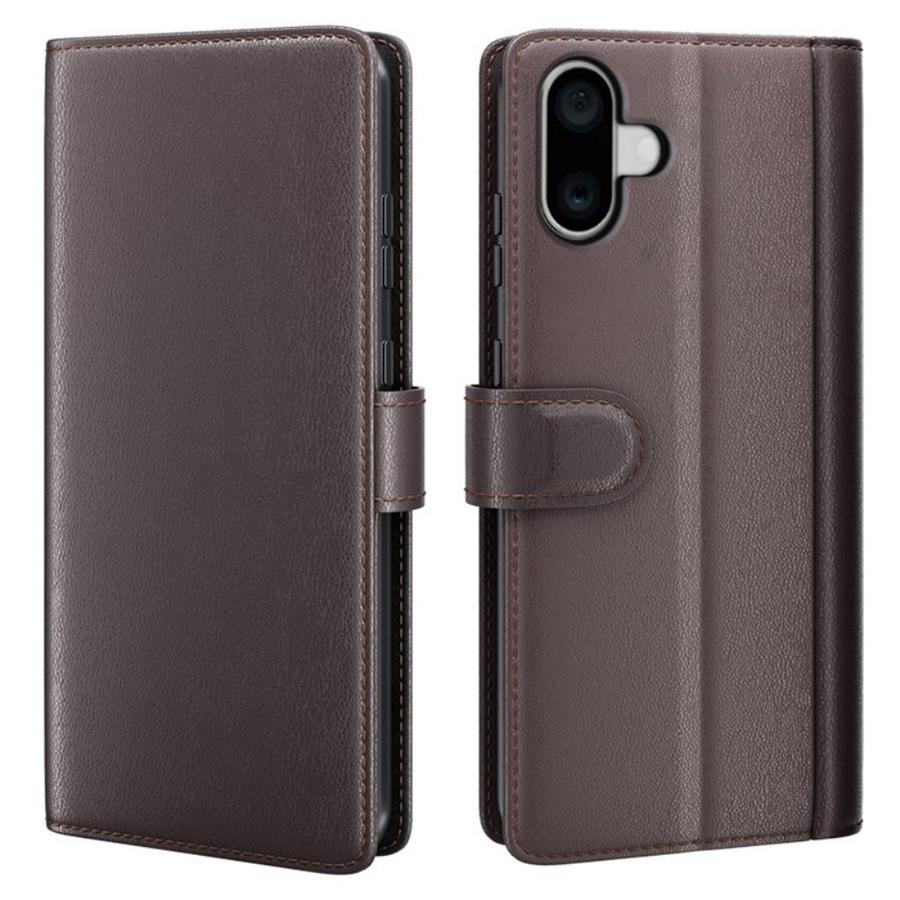Kahvinruskea nahkakotelo on vahva suoja Apple iPhone 16 Plus -puhelimelle, jotta se säilyy turvassa kolahduksilta ja iskuilta.