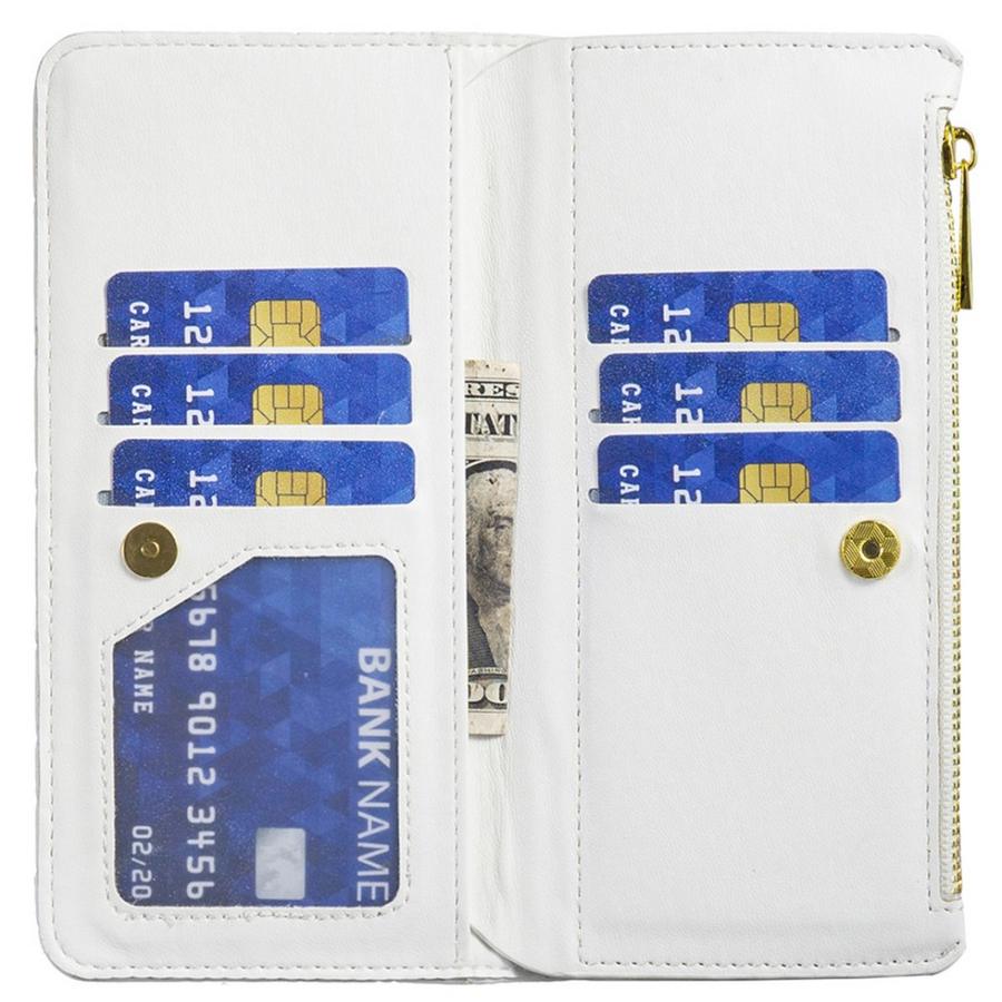 Hillitysti kuvioitu elegantin valkoinen lompakko on tilava sekä sisältää suojan Apple iPhone 16 Plus puhelimen turvalliseen kuljettamiseen.