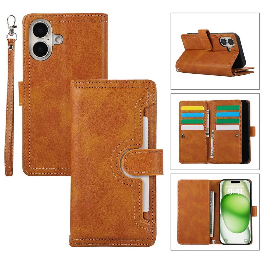 Tyylikäs ja tilava lompakko pehmeässä ruskean sävyssä sisältää erinomaisesti suojaavan sijainnin Apple iPhone 16 Plus älypuhelimelle.