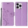 Sievällä kukkaköynnöksellä ja perhosilla kuvioitu vaaleanvioletti kotelo on kattava rikkoutumisen suoja Apple iPhone 16 Pro puhelimelle.