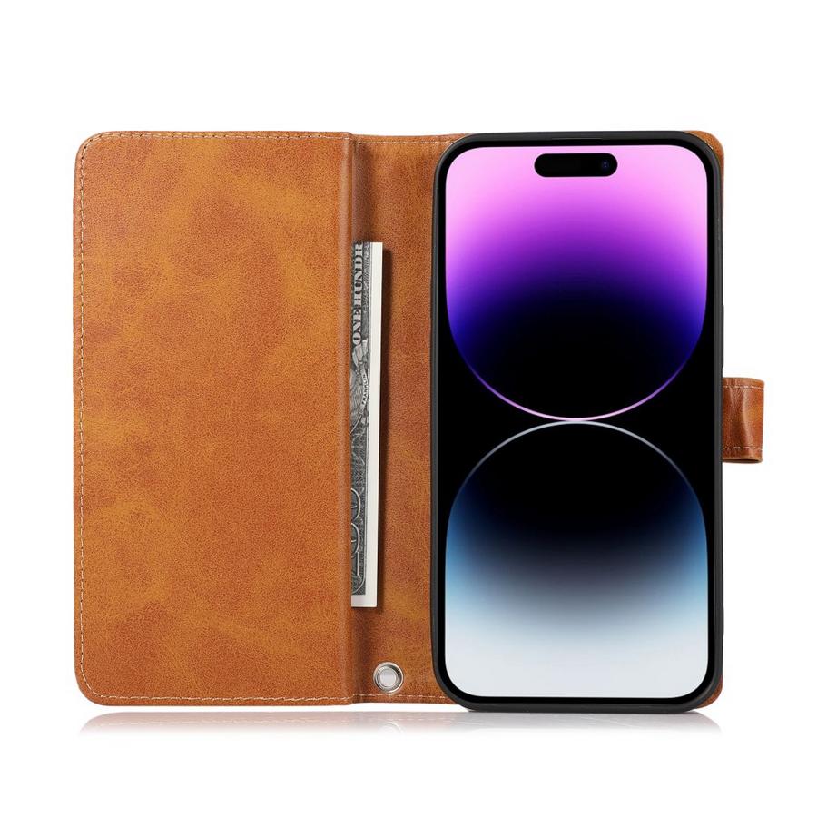Tyylikäs ja tilava lompakko pehmeässä ruskean sävyssä sisältää erinomaisesti suojaavan sijainnin Apple iPhone 16 Pro älypuhelimelle.