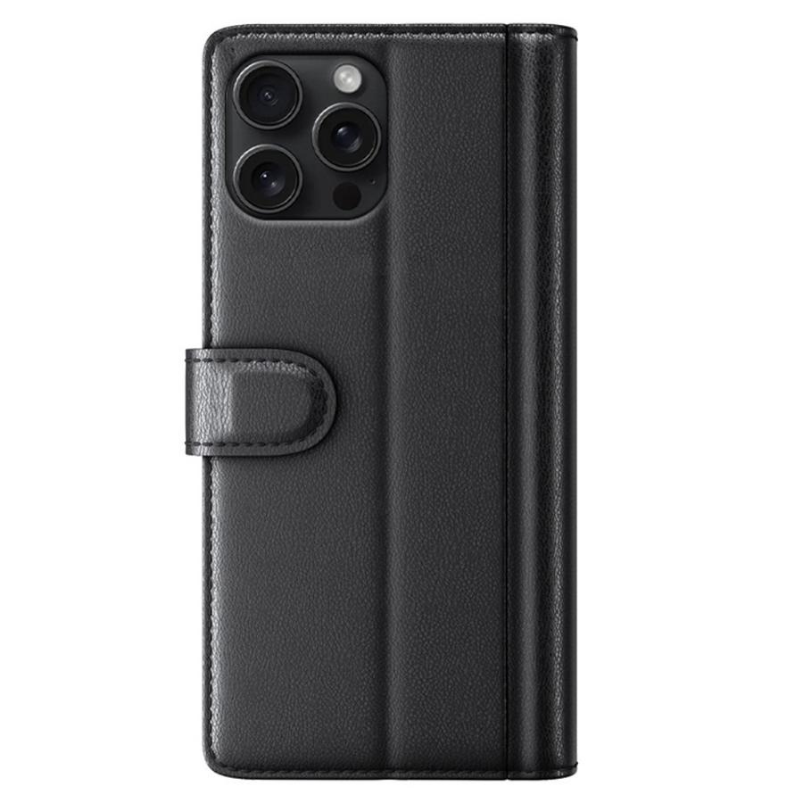 Tilava, ajattoman musta lompakko Apple iPhone 16 Pro puhelimelle, suunniteltu tarjoamaan tyylikäs ulkonäkö ja hyvä suojaus.