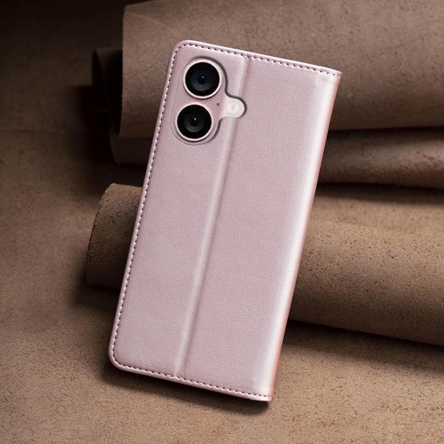 Apple iPhone 16 puhelimelle sopiva, kattavasti suojaava lompakkomallin kotelo, jonka kansissä on kauniin pehmeäsävyisen ruskea väritys.