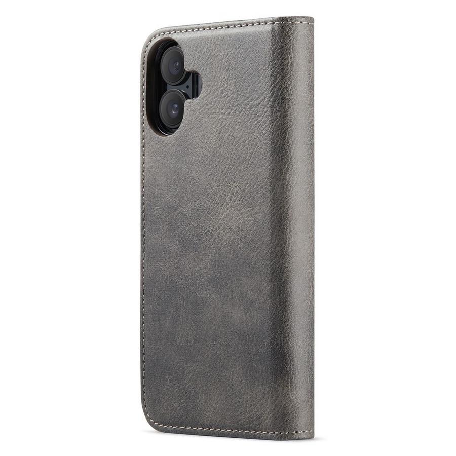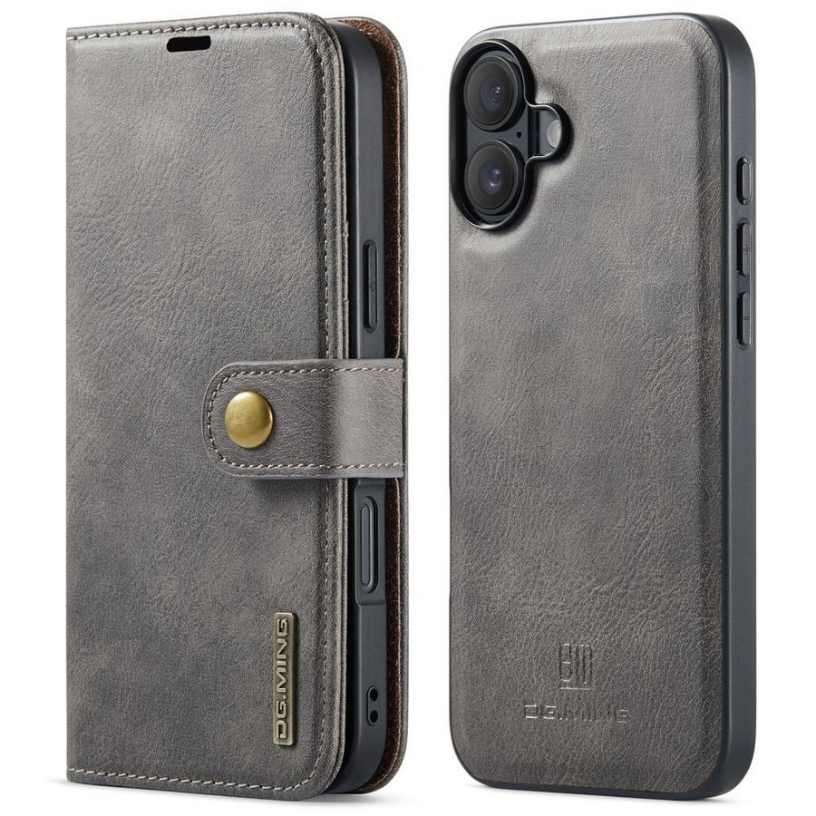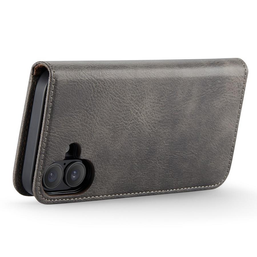 Hillityn harmaasävyinen, nahkakuvioitu ja jämäkkä yhdistelmäkotelo suojaa Apple iPhone 16 puhelinta ja on todella käteväksi suunniteltu.