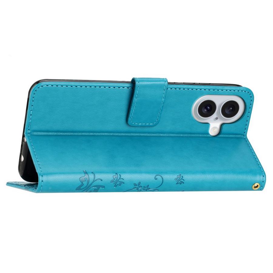 Petroolinsävyinen, sinisen värinen ja ihastuttavasti painamalla kuvioitu kotelo, joka suojaa Apple iPhone 16 puhelinta vahingoittumiselta.