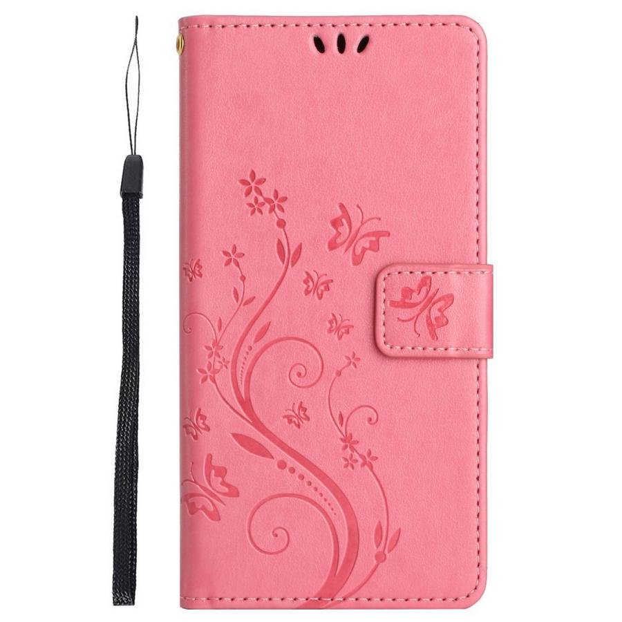 Kukkien ja perhosten kuvioima, soman värinen suojakotelo puhelimesi turvaksi.