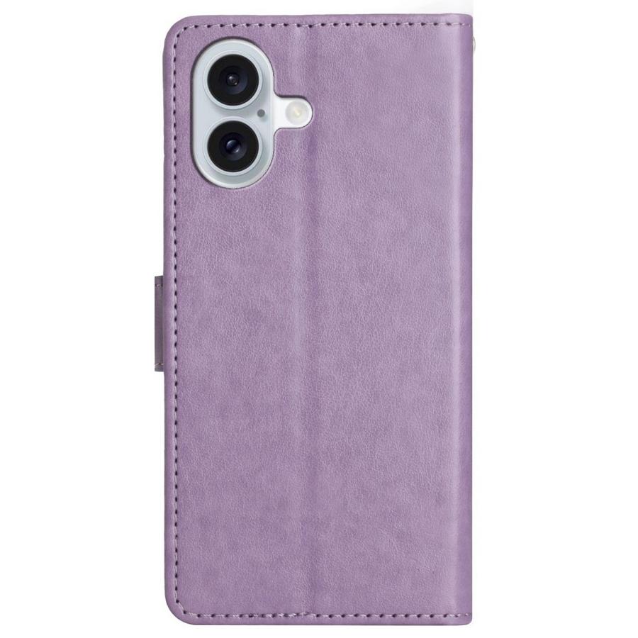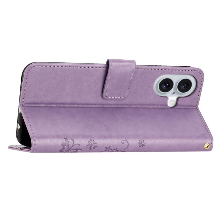 Sievästi kukkaköynnöksellä ja perhosilla kuvioitu vaaleanvioletti kotelo on kattava rikkoutumisen suoja Apple iPhone 16 puhelimelle.