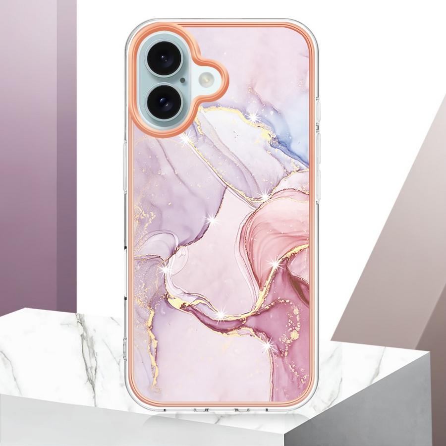 Apple iPhone 16 -puhelinta rikkoutumiselta suojaava, vahva takakuori on marmorikuvioitu ihastuttavan hempeillä värisävyillä.