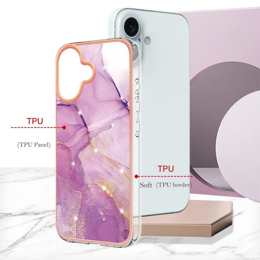 Apple iPhone 16 -puhelimelle sopiva, ihastuttavin violetin sävyin marmorikuvioitu kuori on kestävä ja vahva suoja osumilta sekä kolahduksilta.