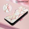 Viehättävä lompakkomallinen kotelo tuo suojan puhelimen joka pinnalle ja pysyy kiinni magneettiläpällä.