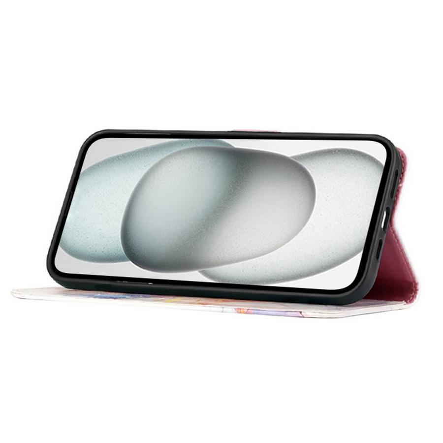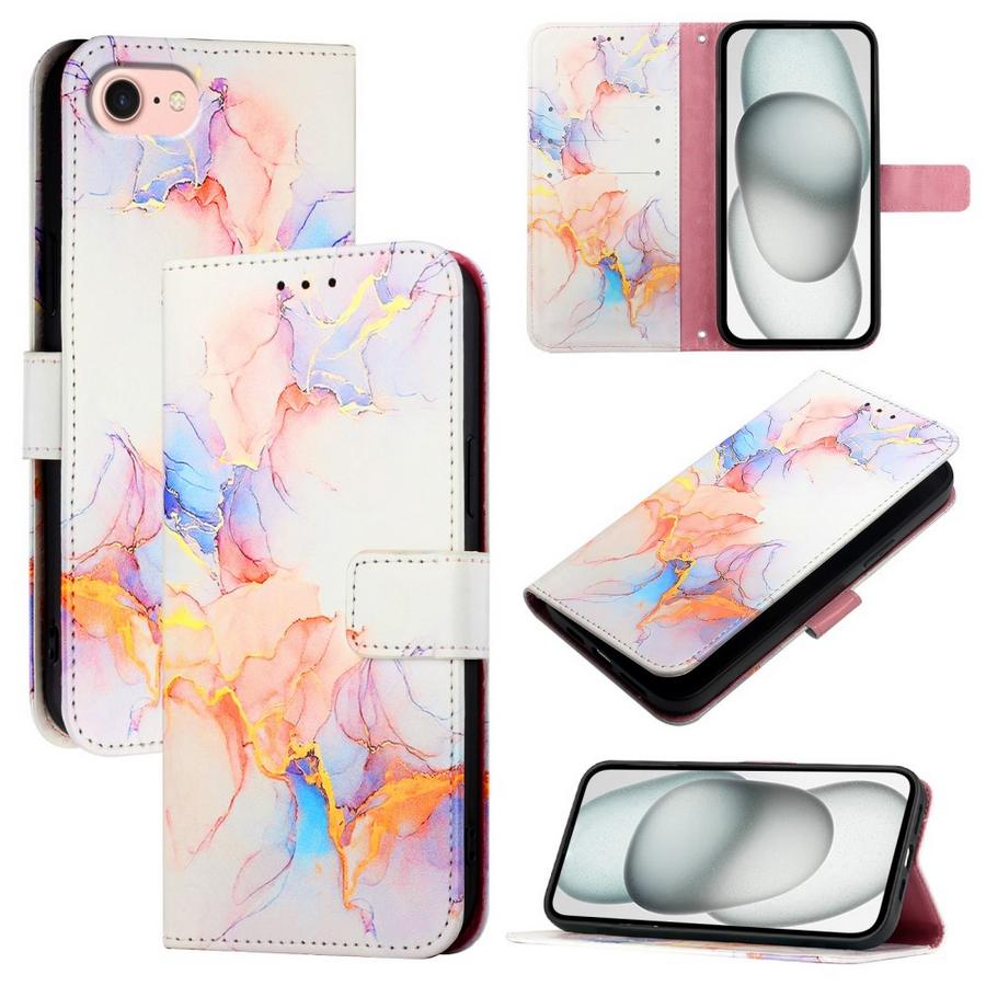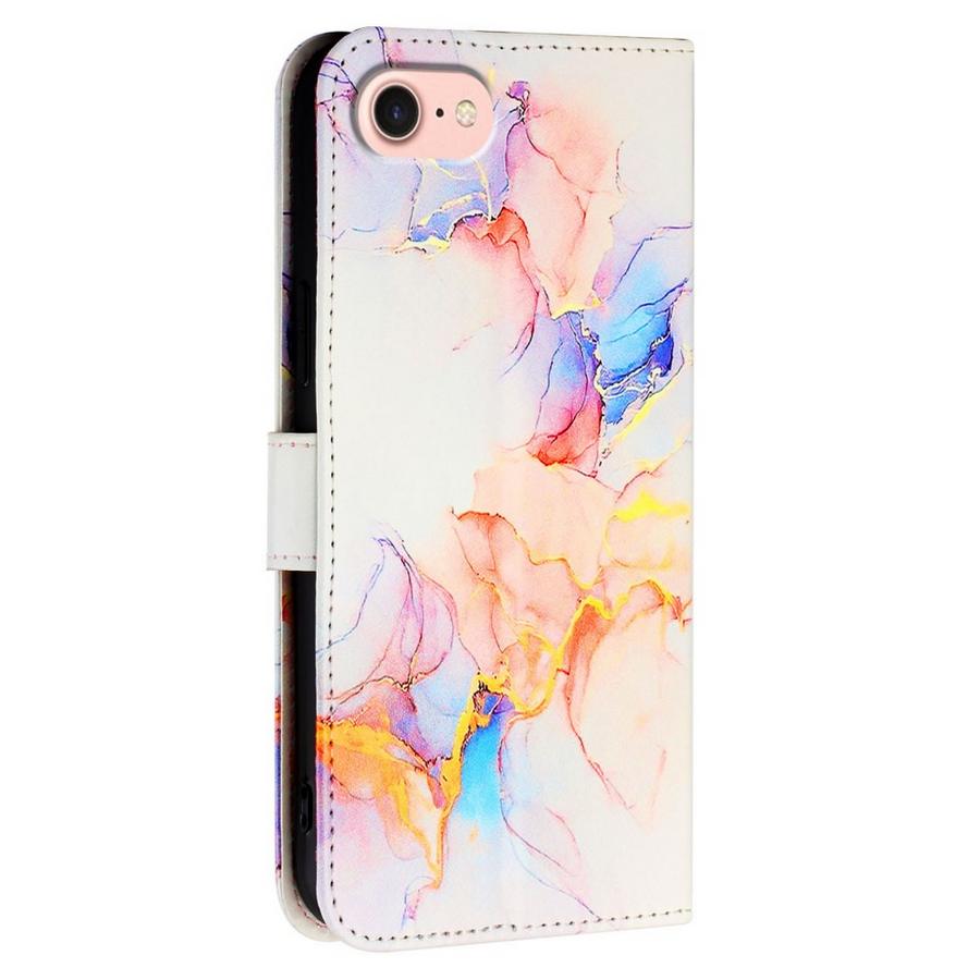 Ihanissa värisävyissä marmoroitujen kuviointien somistama lompakkomallinen suojakotelo Apple iPhone 16e -älypuhelimelle.