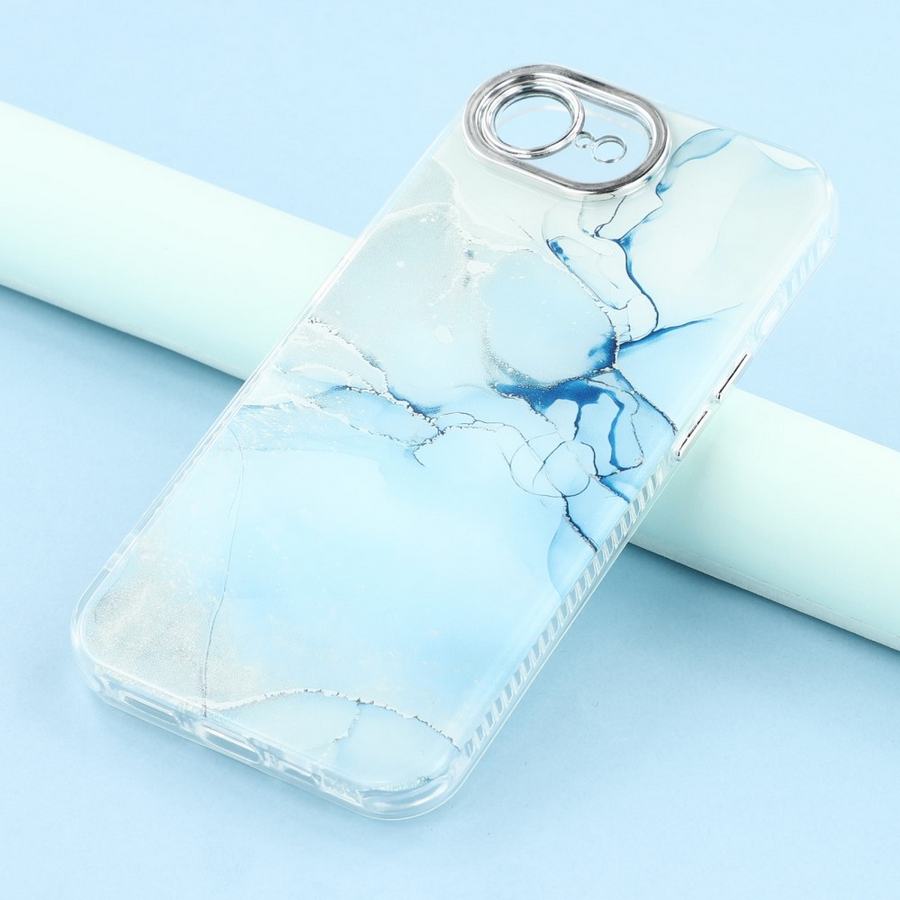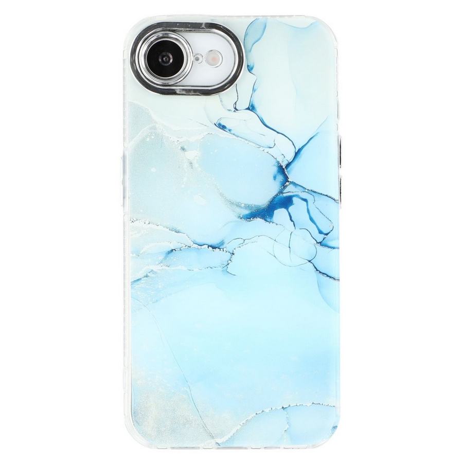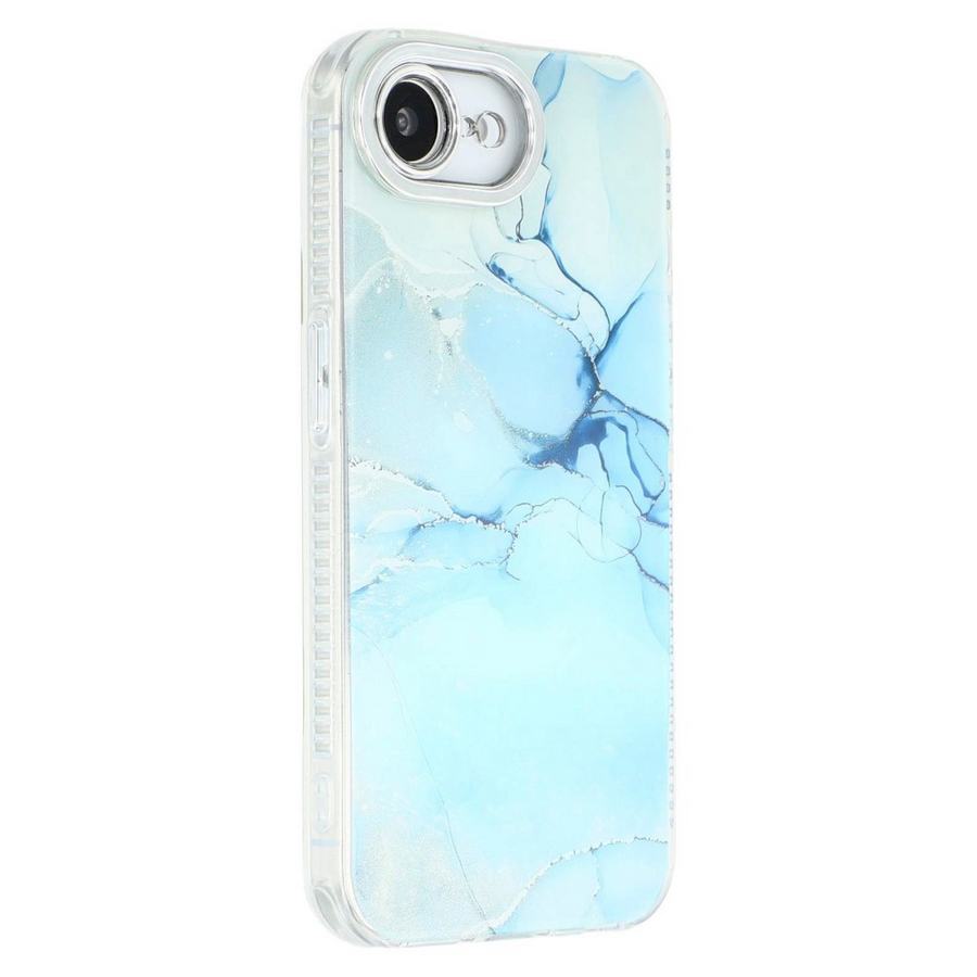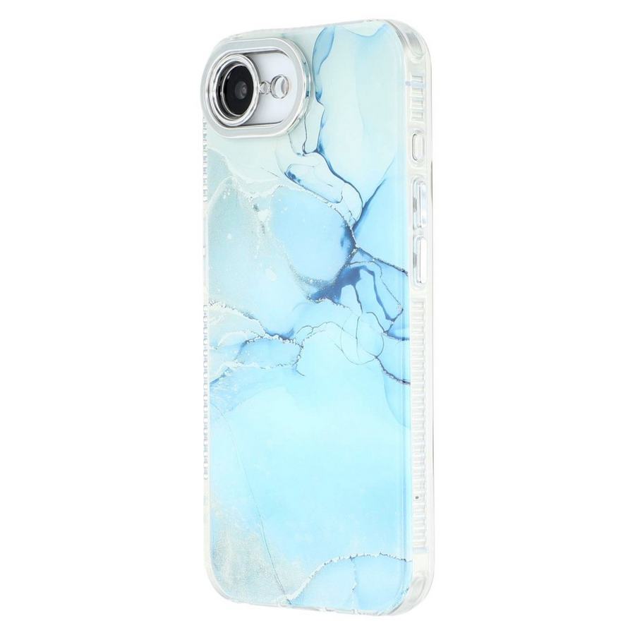 Marmorikuvioinneilla ja heleillä sinisen sävyillä somistettu takakuori on luja särkymisen estävä suoja Apple iPhone 16e puhelimelle.