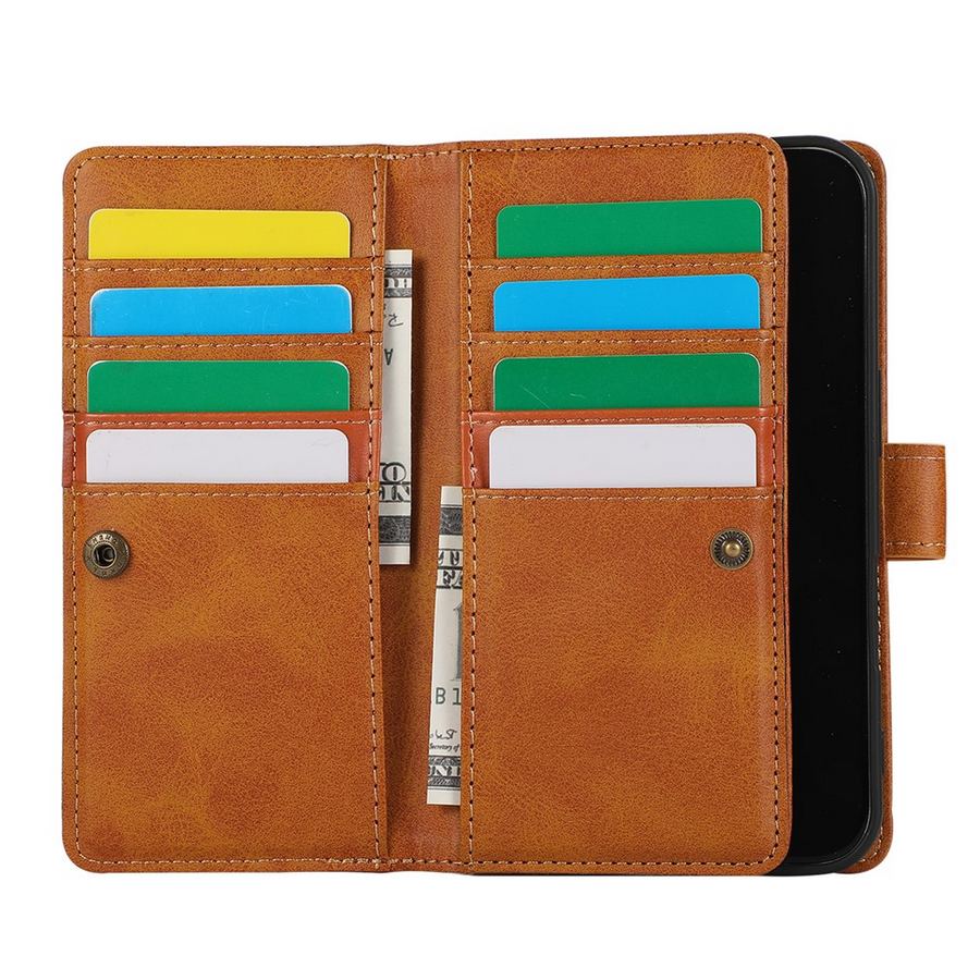 Tyylikäs ja tilava lompakko pehmeässä ruskean sävyssä sisältää erinomaisesti suojaavan sijainnin Apple iPhone 17 älypuhelimelle.