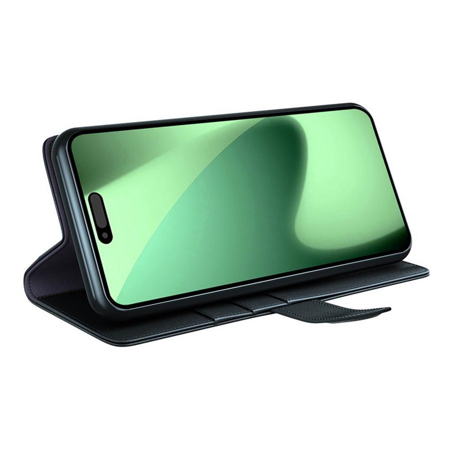 Todella kestävä, käytännöllisen mallinen ja klassisen tyylikkäästi mustakantinen nahkakotelo Apple iPhone 17 Pro Max -älypuhelimelle.