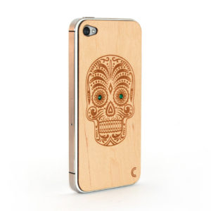 Tyylikäs aito puukuori, johon on kaiverrettu koristeltu meksikolainen sugar skull pääkallo ja jonka silmät on koristeltu vihreillä koristekivillä.