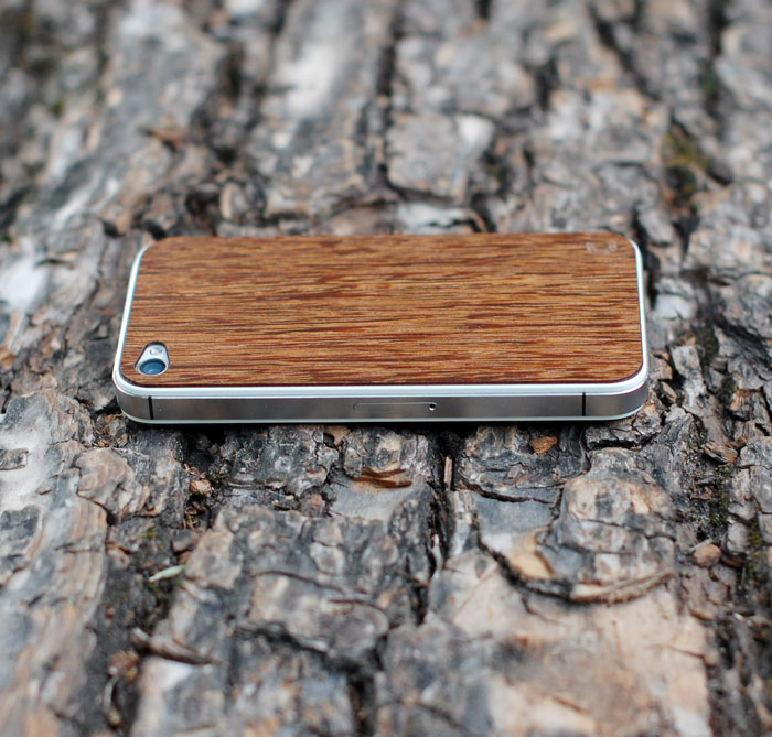 Vain 0,7mm paksu aito puukuori kiinnitetään helposti puhelimen takakanteen tarrakiinnityksellään.