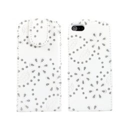 Upea valkoinen pystysuuntaan avautuva koristeltu läppäkotelo sopii Apple iPhone 5, Apple iPhone 5s ja Apple iPhone SE puhelimiin.