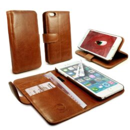 Suojaa Apple iPhone 6 Plus älypuhelin erittäin laadukkaalla ja tyylikkäällä ruskealla lompakkokotelolla, joka on valmistettu aidosta nahasta.