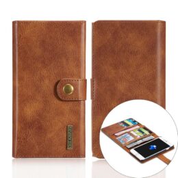 Ruskea nahkakotelo auttaa suojaamaan Apple iPhone 7 / 8 Plus puhelinta kolhuilta ja siinä säilytät kortit ja kuitit.