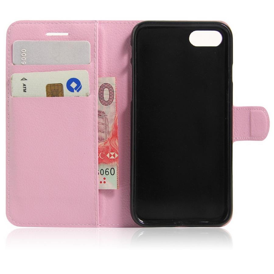 Särkymiseltä ja naarmuilta napakasti suojaava lompakkokotelo Apple iPhone 7 / 8 / SE (2020) puhelinmalleille, kansissa suloisen vaaleanpunainen väritys.