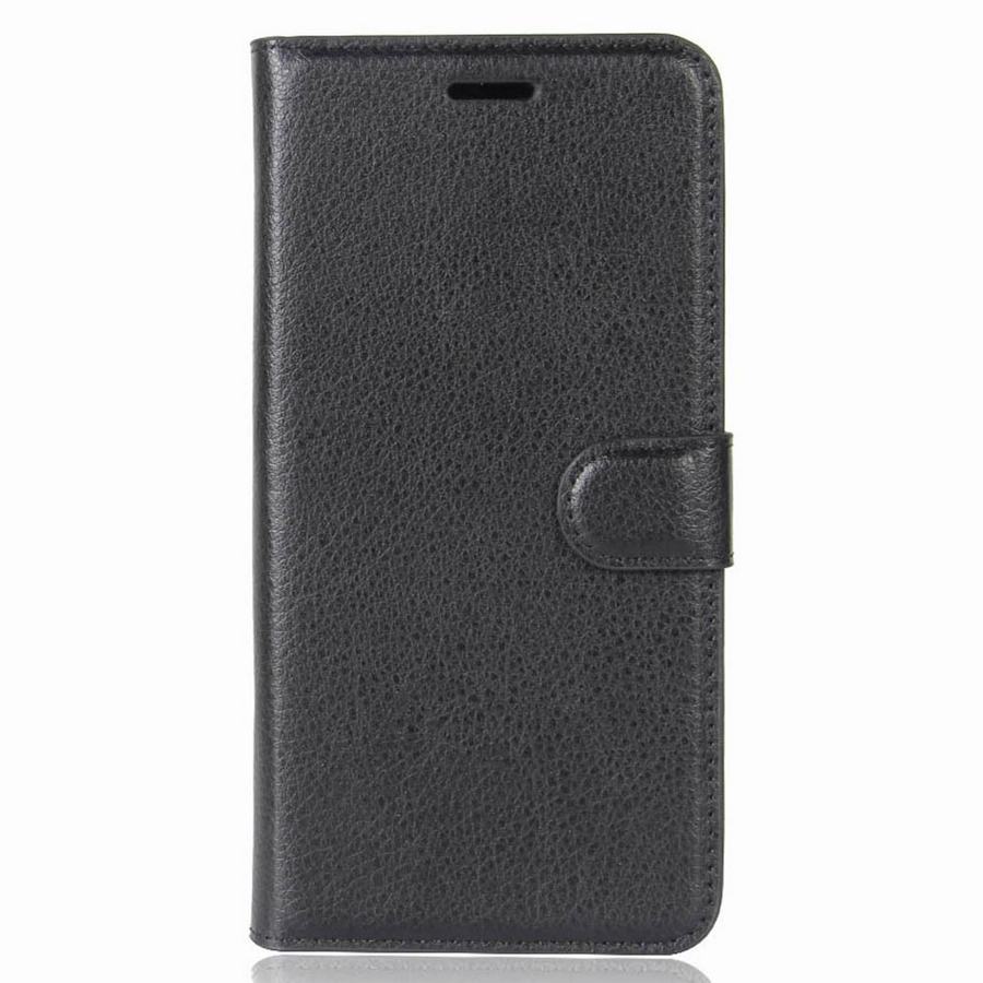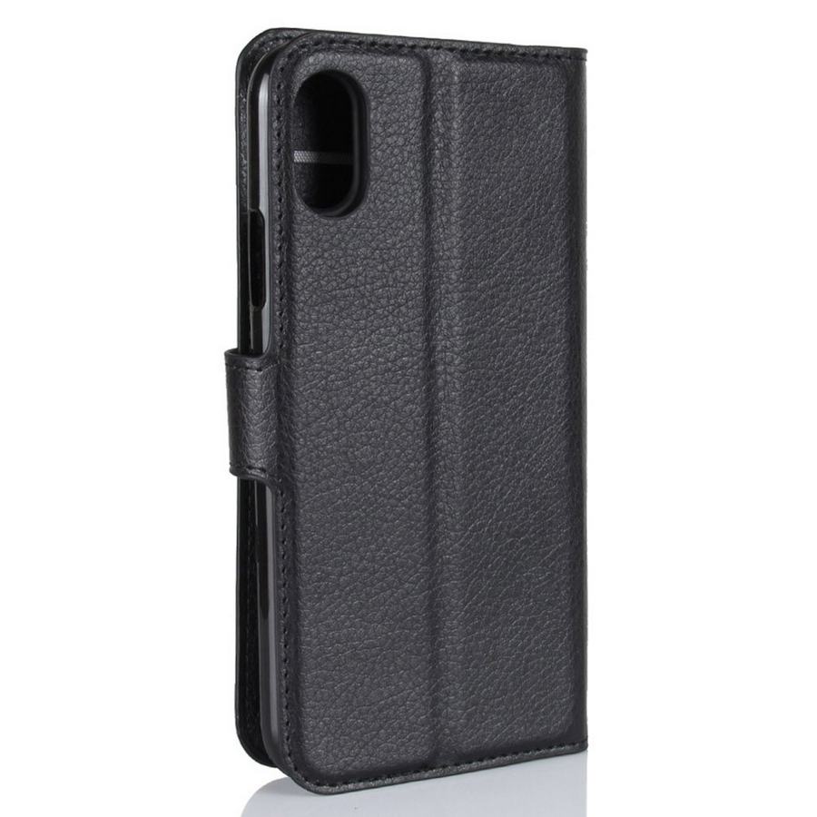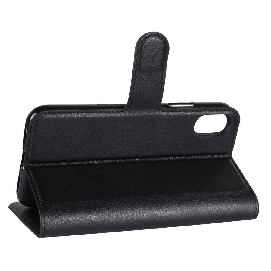 Klassinen mustakantinen lompakkokotelo, jossa Apple iPhone X / Xs -älypuhelin tehokkaasti suojattuna vahingoilta ja pintojen naarmuilta.