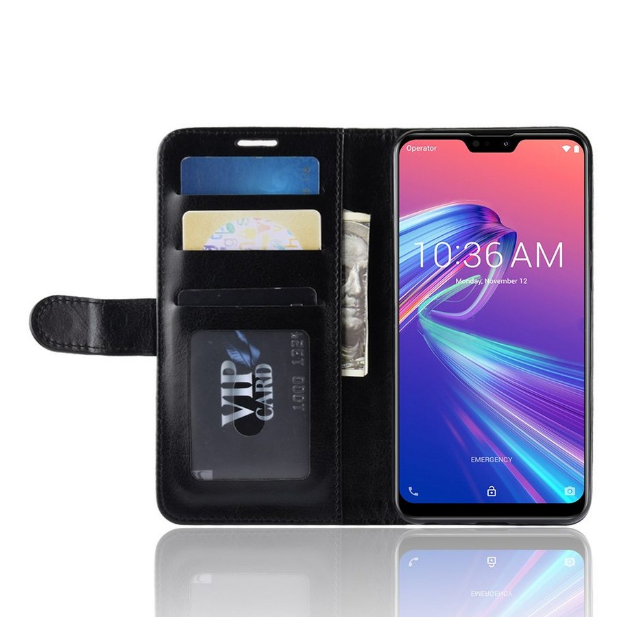 Mustassa Asus Zenfone Max Pro M2 ZB631KL puhelimeen sopivassa suojakotelossa on kolme korttipaikkaa, leveä tasku, jalusta-toiminto ja magneettisuljenta.