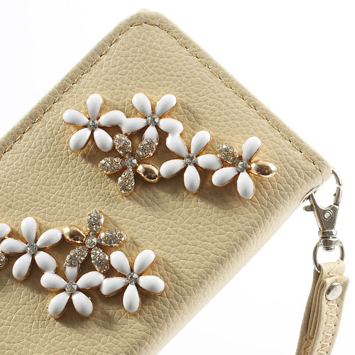 Suojaa puhelimesi tyylikäällä beigellä lompakkokotelolla, joka on koristeltu kukkasilla.