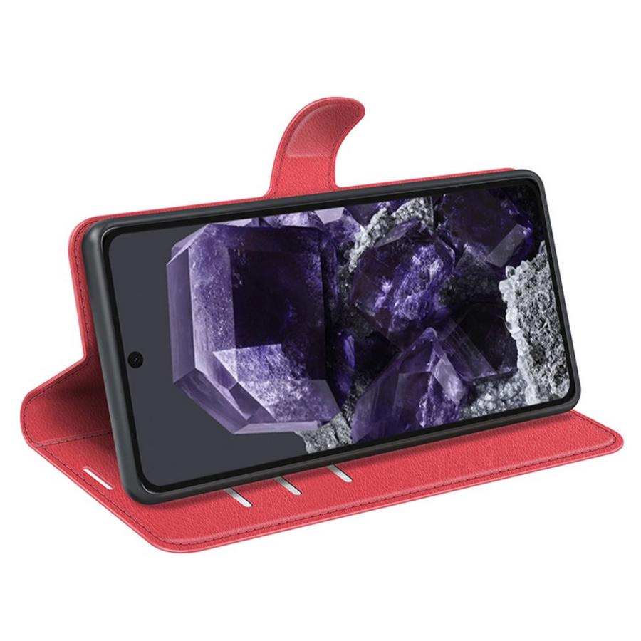 Viehättävän punainen lompakkokotelo on malliltaan käytännöllinen ja suojaa kattavasti Google Pixel 8a -älypuhelinta arjen vahingoilta.