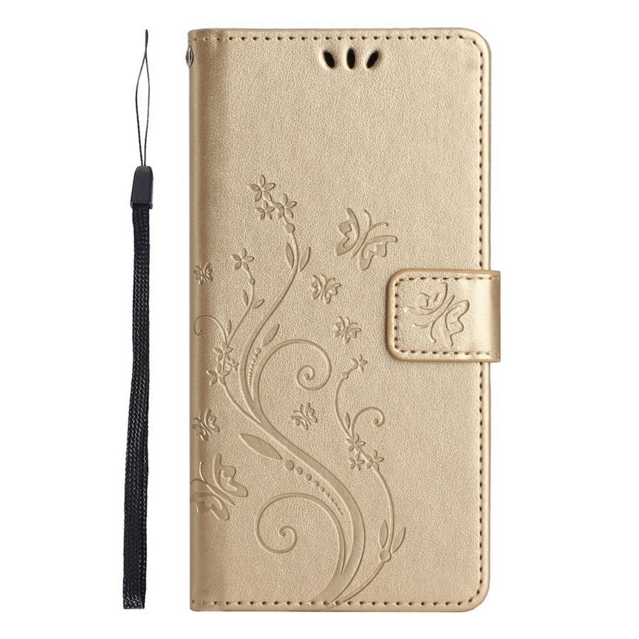 Viehättävä kukin ja perhosin kuvioitu lompakkokotelo on tehokas suoja osumilta ja puhelimen naarmuuntumiselta.