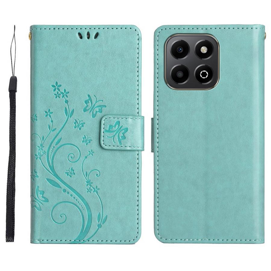 Vahingoilta suojaava kotelo Honor 200 Smart 5G puhelimelle on väriltään raikkaan turkoosi ja somistettu ihanasti kukkaköynnöksellä ja perhosilla.