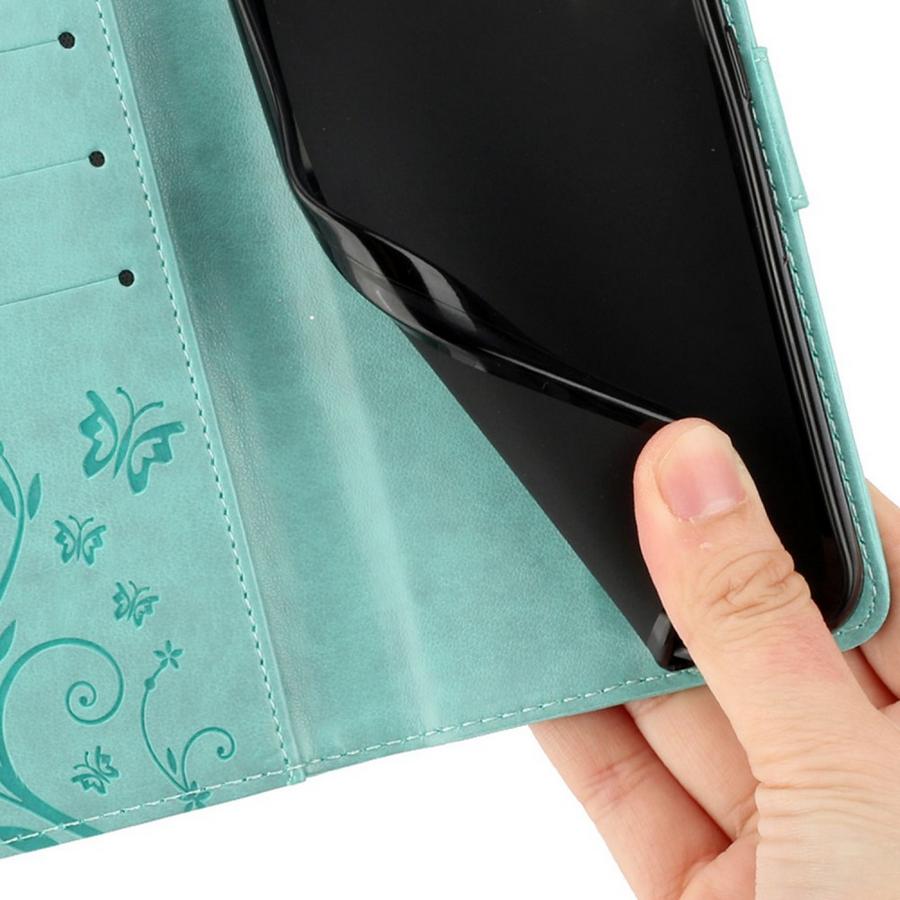 Upea perhosin ja kukkasin kuvioitu lompakkokotelomalli pitämään puhelin käyttökunnossa ilman säröjä tai naarmuja.