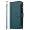 Hillitty tummansävyisen vihreä lompakko on erittäin tilava ja sen suojassa Honor 400 5G puhelin on turvattu vaurioilta.