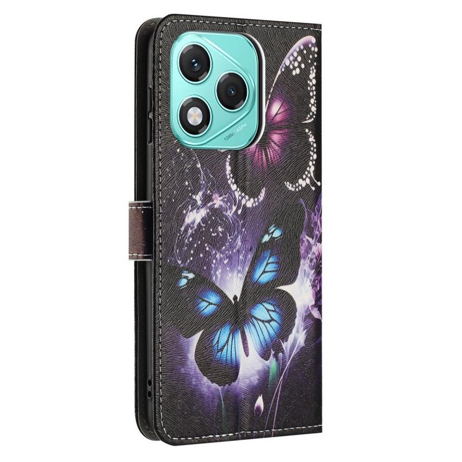 Honor 400 Lite 5G puhelimen suojaava lompakkokotelo, jonka tummissa kansissa on upeat ja kauniin väriset perhoskuvioinnit.