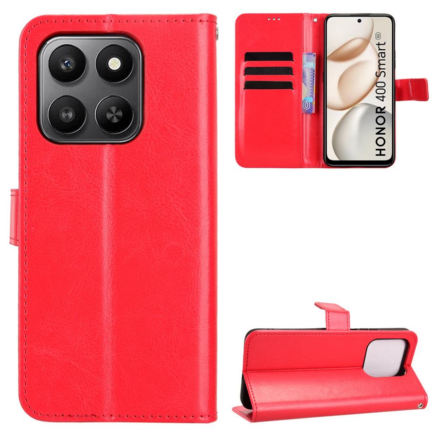 Viehättävän kaunis ja punaisessa värityksessä edukseen erottuva lompakkokotelo suojaamaan Honor 400 Smart 5G -puhelinmallia rikkoutumiselta.