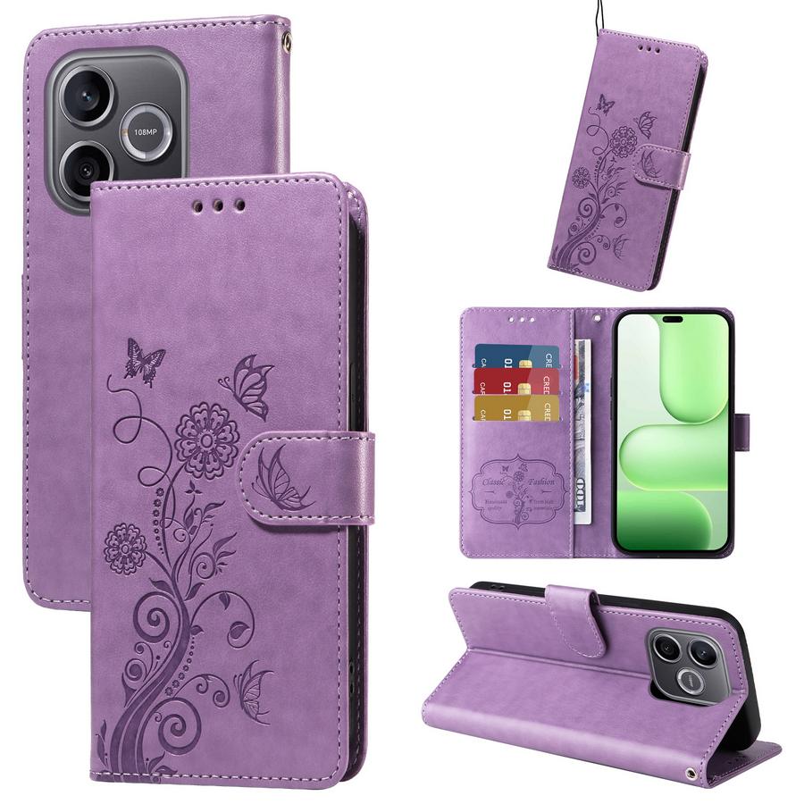 Kukkaköynnöksellä ja perhosilla somistettu vaaleasävyisen violetti kotelo on kattava vahingoittumisen suoja Honor 600 Lite 5G puhelinmallille.