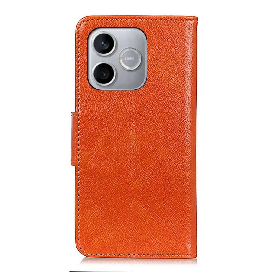 Kiiltäväpintainen ja oranssin värinen nahkakotelo on erittäin kestävä vahingoittumisen suoja Honor 600 Lite 5G -älypuhelimelle.