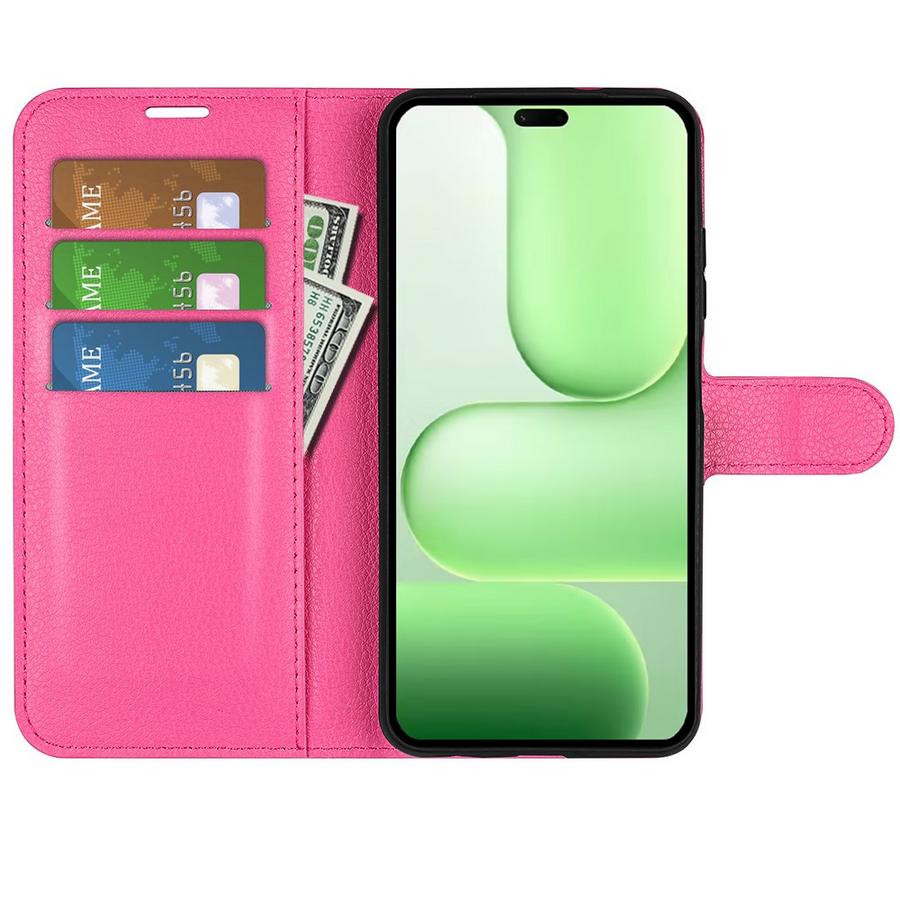 Naarmuilta ja vauriolta suojaava lompakkomallinen kotelo Honor 600 Lite 5G puhelimelle, kansissa ihanan pirteä pinkki väritys.