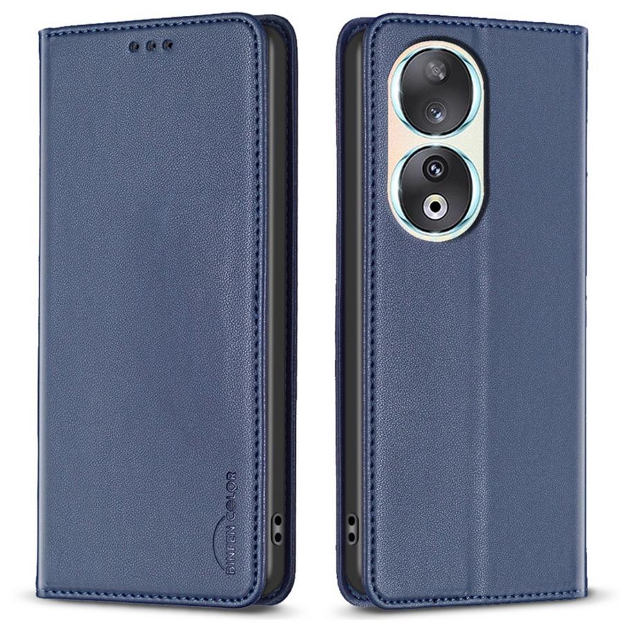 Linjakkaasti muotoiltu kotelo hillityn eleganteilla tummansinisillä kansilla suojaa kauttaaltaan Honor 90 5G puhelinmallia.