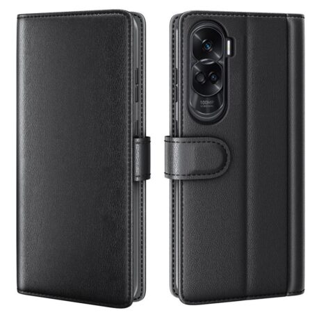 Todella kestävä, käytännöllisen mallinen ja klassisen tyylikkäästi mustakantinen nahkakotelo Honor 90 Lite 5G -älypuhelimelle.